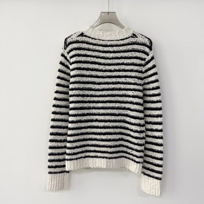 The twinset offers a new take on a timeless classic with the Dior Marinière motif. Crafted in a white and black blended wool and cotton bouclé knit, it is composed of a tank top and cardigan with patch pockets and black horn buttons adorned with a gold-tone anchor. Completed with ribbed finishes, the twinset can be paired with a skirt from the collection for a hallmark look.