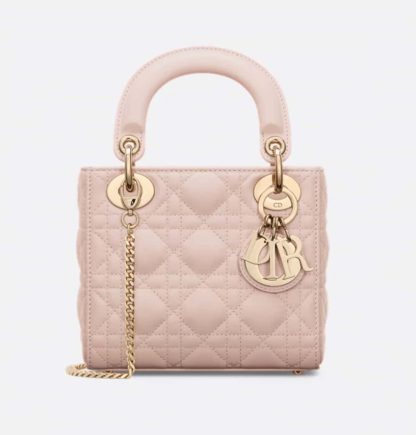 The Lady Dior bag embodies Dior’s vision of elegance and beauty. Sleek and refined, the timeless and modern style is crafted in powder pink lambskin with Cannage stitching, creating the instantly recognizable quilted texture. Pale gold-finish metal D.I.O.R. charms further embellish and highlight its silhouette. Featuring a removable chain shoulder strap, the miniature Lady Dior bag can be carried by hand, worn over the shoulder or crossbody as an ideal evening wear companion.